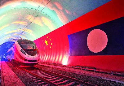 10月15日,中老铁路开通在即,“澜沧号”动车组通过中老友谊隧道内的两国边界。新华社发