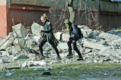 俄乌冲突爆发后,双方在乌克兰南部港口城市马里乌波尔连日展开激战。图为3月23日,当地居民从被战火损坏的建筑旁走过。新华社发