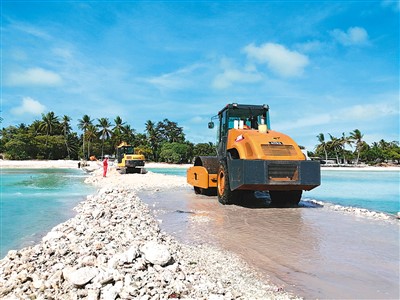 在基里巴斯首都塔拉瓦,中国企业正在为当地民众修筑一座便桥。新华社发(中国中铁一局供图)