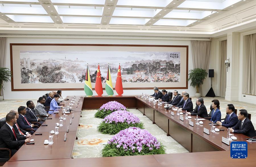 7月28日上午,国家主席习近平在成都会见来华出席第31届世界大学生夏季运动会开幕式并访华的圭亚那总统阿里。新华社记者 张领 摄