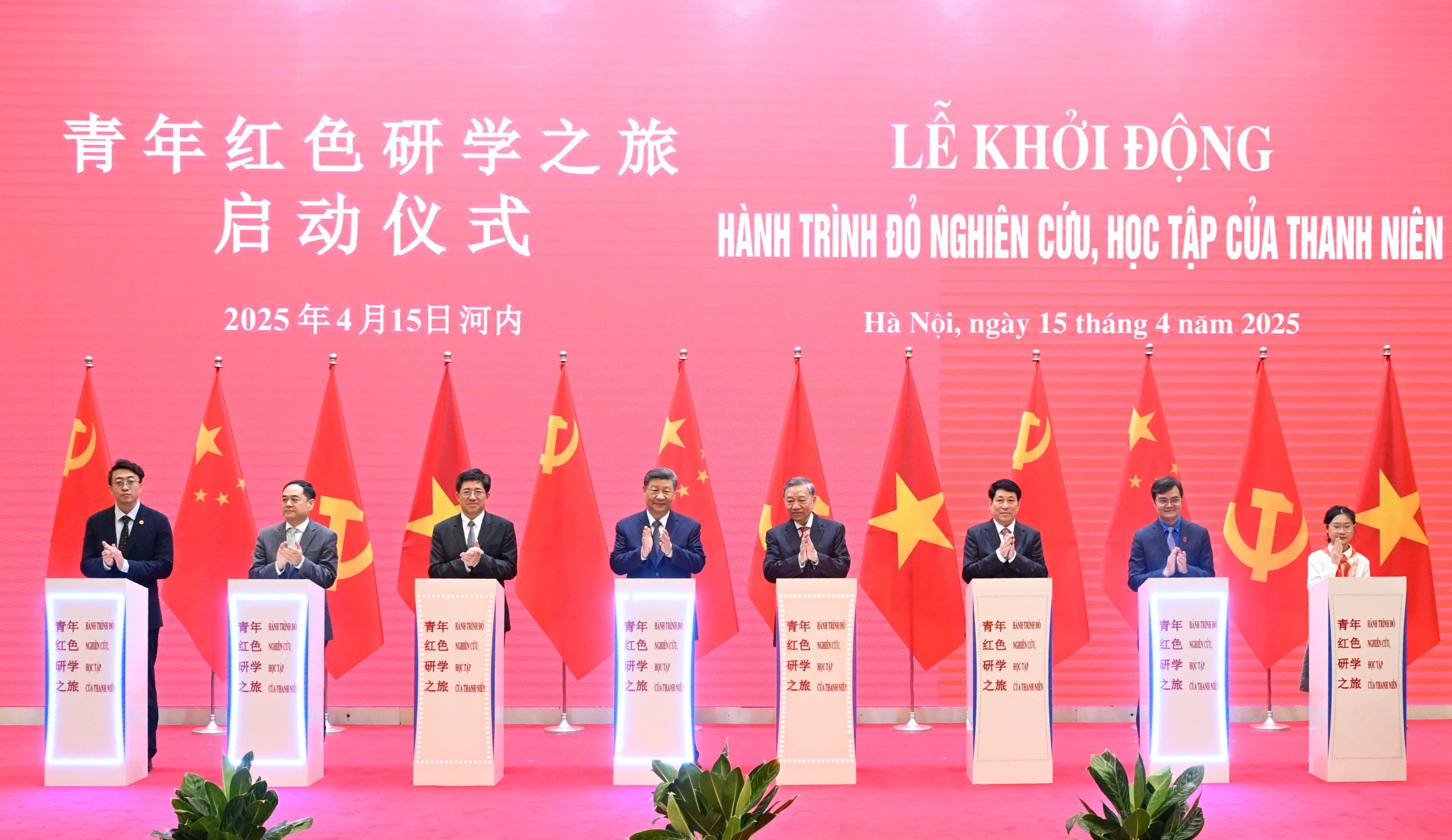 4月15日上午,中共中央总书记、国家主席习近平在河内国际会议中心同越共中央总书记苏林、越南国家主席梁强共同会见中越人民大联欢活动代表。这是活动后,习近平和苏林、梁强共同启动“红色研学之旅”项目。新华社记者 申宏 摄