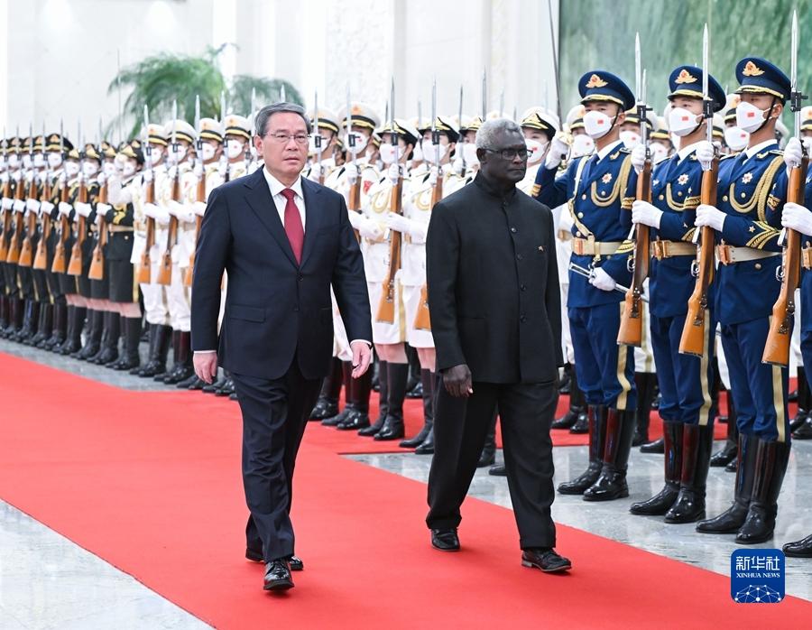 7月10日上午,国务院总理李强在北京人民大会堂同来华进行正式访问的所罗门群岛总理索加瓦雷会谈。这是会谈前,李强在人民大会堂北大厅为索加瓦雷举行欢迎仪式。新华社记者 岳月伟 摄