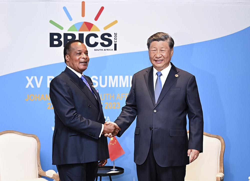 当地时间8月24日上午,国家主席习近平在约翰内斯堡出席金砖国家领导人会晤期间会见刚果(布)总统萨苏。新华社记者 谢环驰 摄