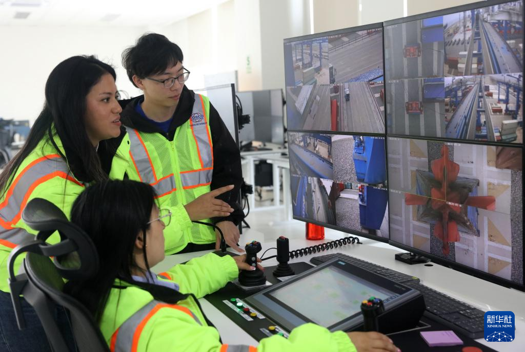10月7日,在秘鲁钱凯港,中远海运港口秘鲁钱凯公司员工阿斯特丽德·洛萨诺(左一)与同事进行作业监控。位于秘鲁首都利马以北约80公里的钱凯港于2024年11月正式开港,标志着中秘共建“一带一路”取得新的重要成果。新华社发 玛丽安娜·巴索 摄