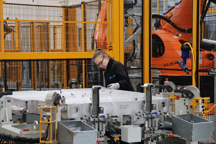 2024年2月24日,在法国吕茨,中国敏实集团与法国雷诺集团成立的合资公司的员工在电池盒产线上工作。新华社记者 张百慧 摄