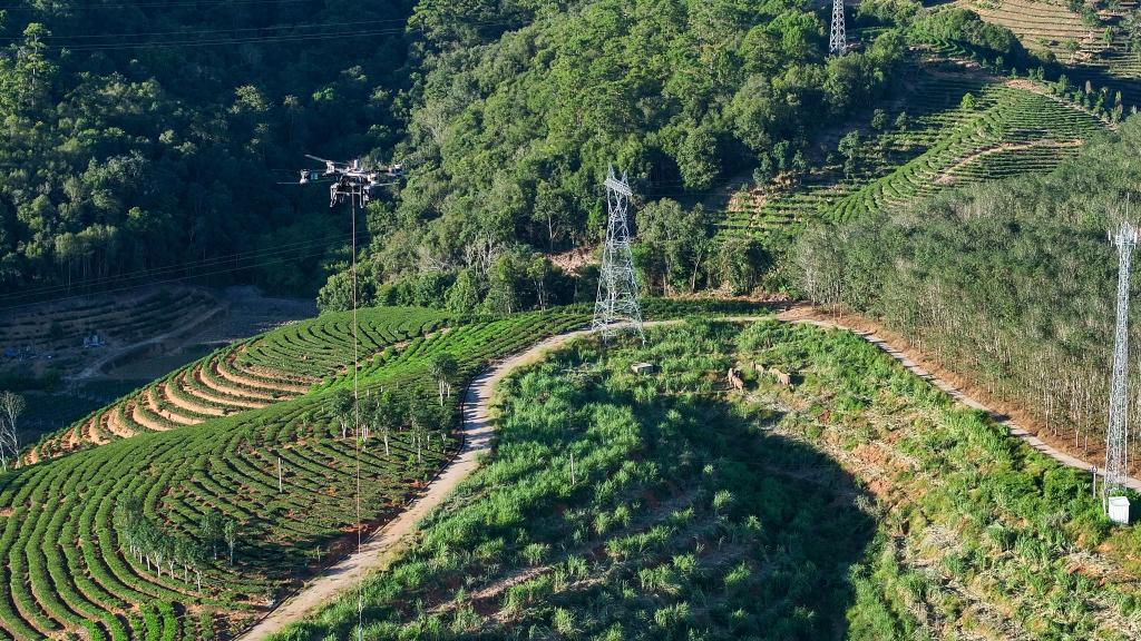 一架重载无人机吊运着电力物资穿梭在西双版纳热带雨林上空,地面上多头野生亚洲象正在漫步。陈波 摄