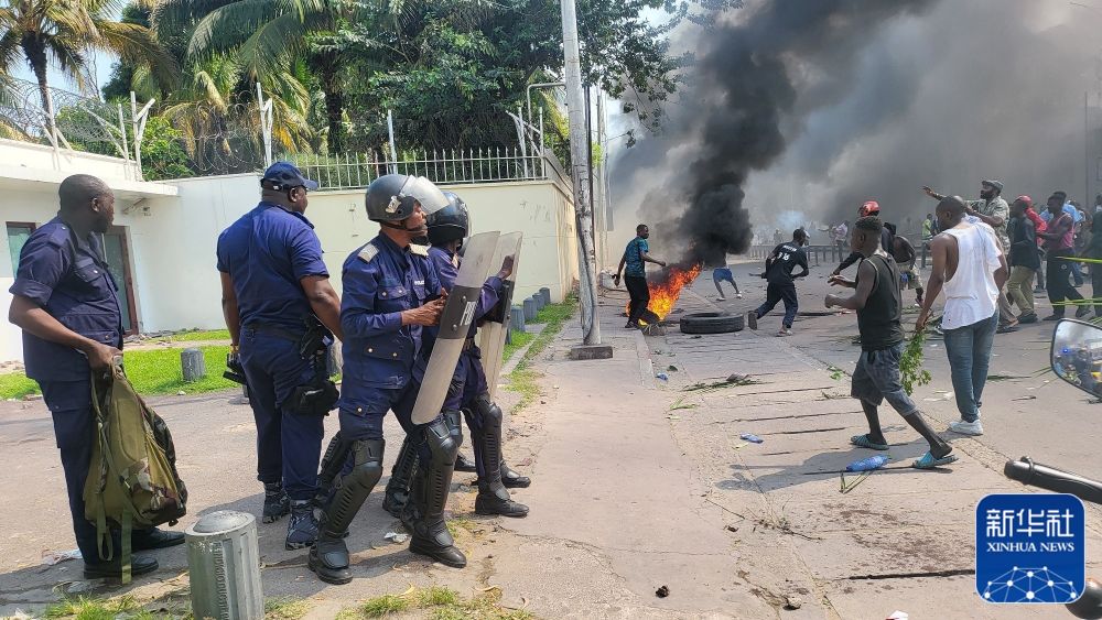 2025年1月28日,在刚果(金)首都金沙萨,刚果(金)警方在法国驻刚果(金)大使馆外与示威人员对峙。刚果(金)首都金沙萨多个地区当日爆发示威活动,示威人员纵火和洗劫了多个外国使馆。新华社发