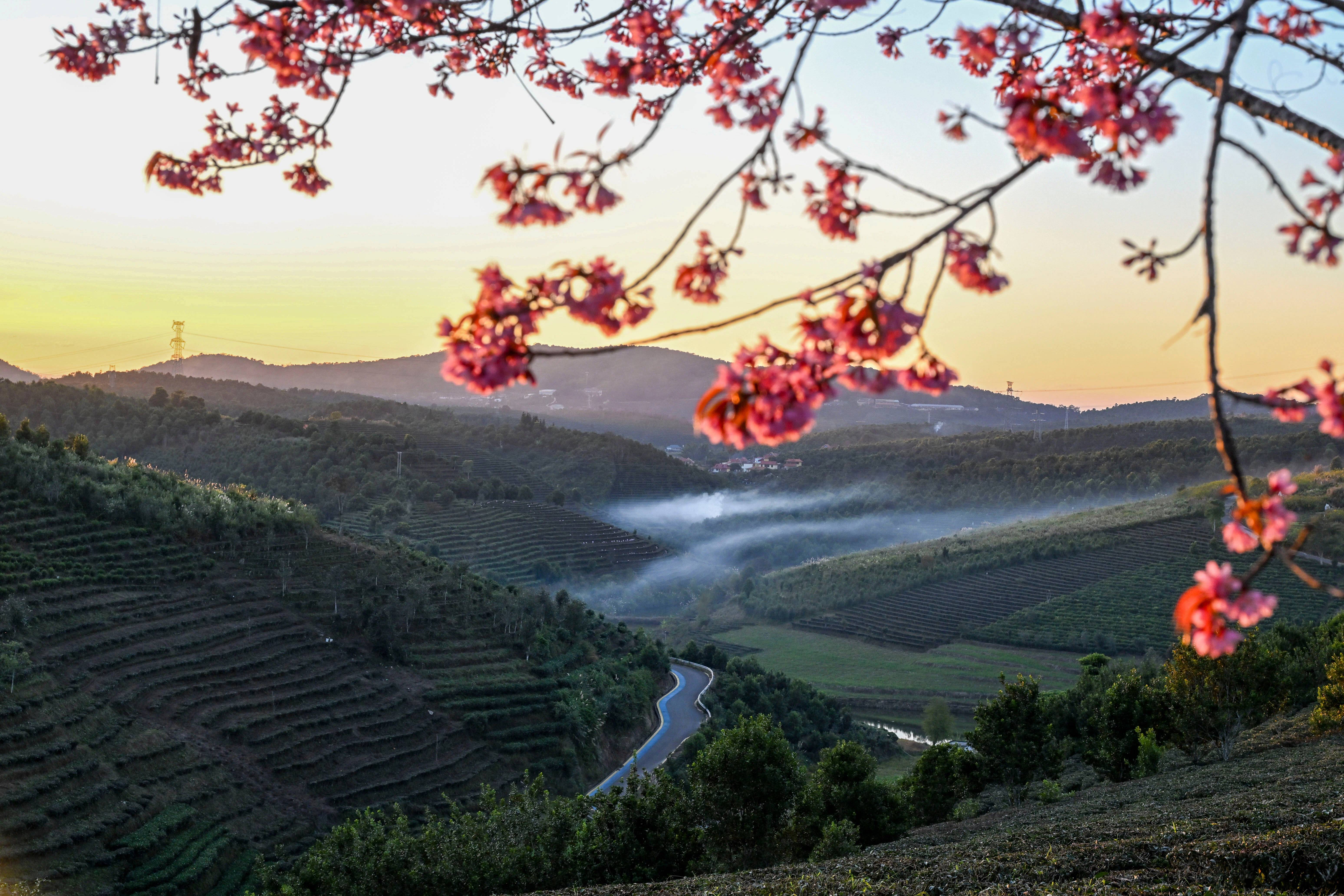 这是2025年12月21日在大渡岗乡拍摄的冬樱花和茶园。新华社记者 陈朔 摄