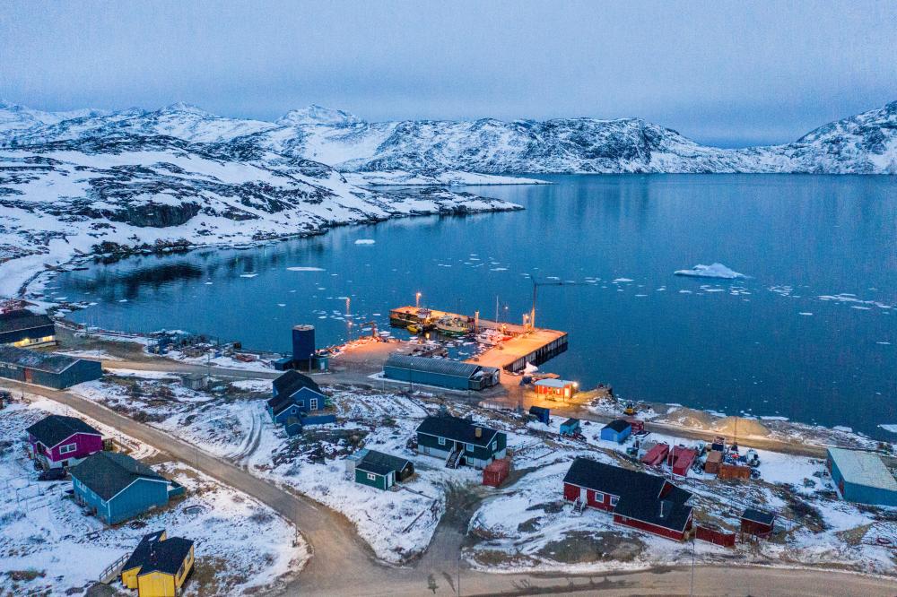 这是2025年3月21日拍摄的丹麦自治领地格陵兰岛纳尔萨克镇的码头(无人机照片)。新华社记者 彭子洋 摄
