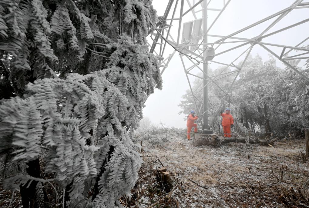 1月19日,孝感供电公司输电运检人员正在开展覆冰观测。新华社发 余健兵 摄