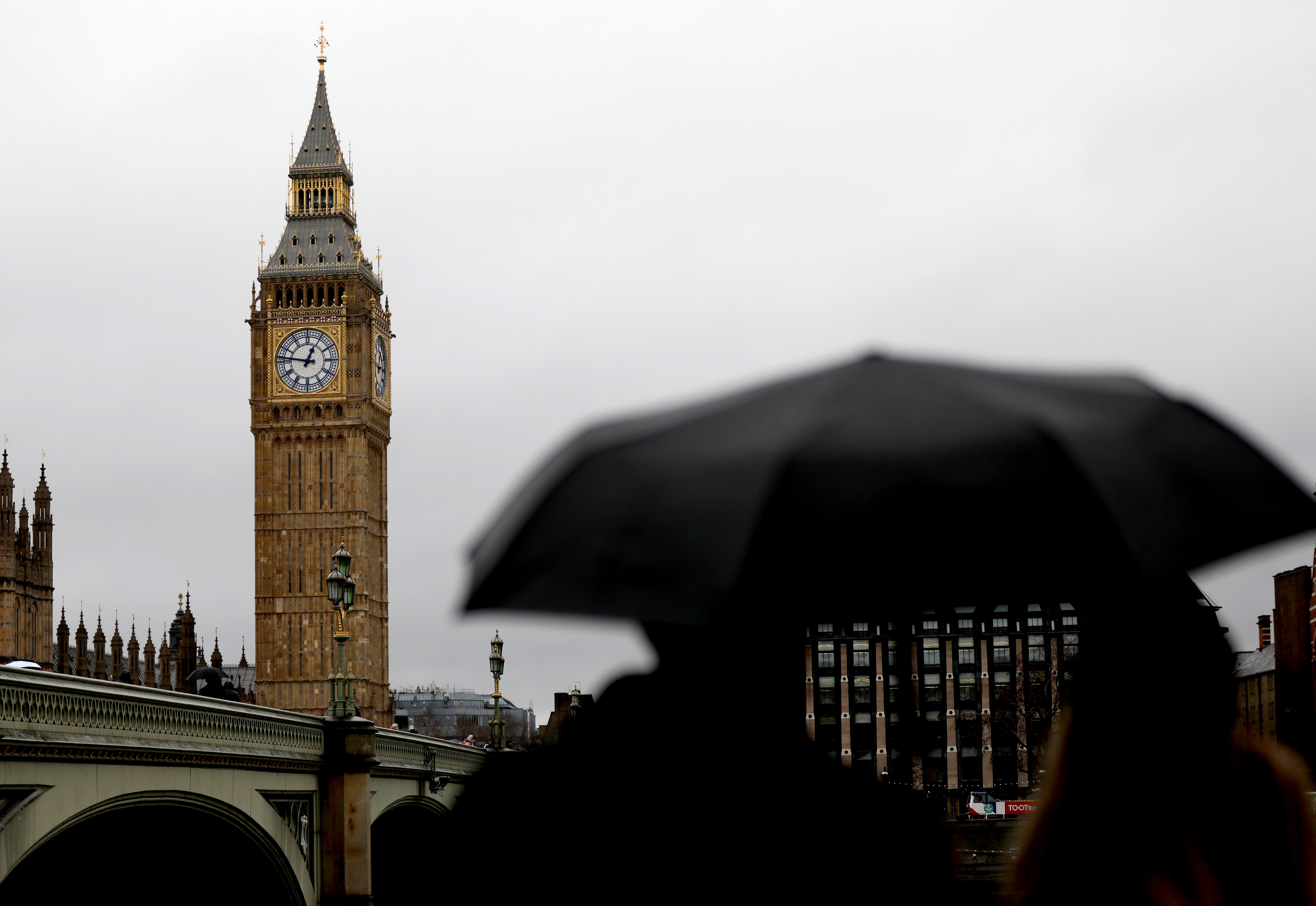 1月27日,人们撑伞行走在英国伦敦大本钟附近。新华社记者 李颖 摄