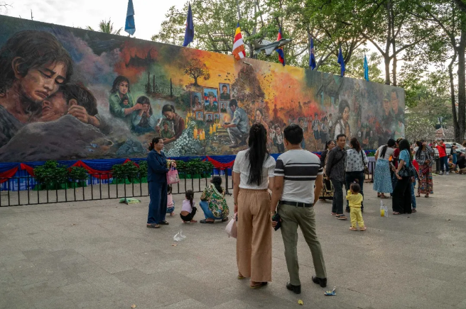 2026年1月3日,在柬埔寨暹粒省暹粒市,一幅影射泰柬冲突的壁画吸引观众驻足。