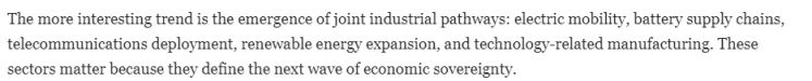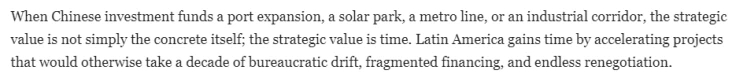 文章认为,拉丁美洲的比较优势众所周知:该地区拥有现代经济的关键资源,从铜和锂到农业产能和可再生能源潜力,应有尽有。此外,许多国家还拥有不断壮大的中产阶级、庞大的城市市场和年轻的劳动力。从历史上看,拉丁美洲缺乏的并非雄心壮志,而是规模:基础设施规模、工业投资规模以及能够经受住政治周期考验的长期融资规模。而中国的比较优势在于其规模优势:它能够以极快的速度和持续性调动资本、工程能力和产业供应链,这几乎是其他任何国家都无法比拟的。此外,中国还拥有长期的国家规划和执行能力。当中国投资用于港口扩建、太阳能发电园区、地铁线路或工业走廊建设时,其战略价值不仅仅在于基础设施本身。当拉丁美洲在加速推进这些项目的时候,这些优势为他们赢得了宝贵的时间。否则,在该地区这些项目可能需要长达十年的时间才能完成,期间会经历互相扯皮的拖延、零散的融资以及无休止的重新谈判。