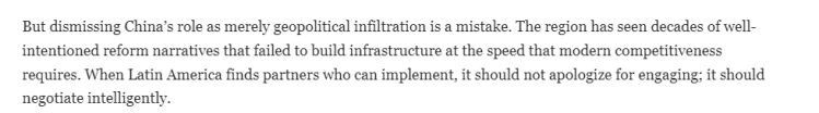 文章说,将中国在拉美的影响视为地缘政治渗透是错误的。拉美地区几十年来经历了许多初衷良好的改革,但基础设施建设的速度还未能达到现代竞争力所需的水平。当拉丁美洲找到能够有效落实改革的伙伴时,它应该与其进行明智的谈判。