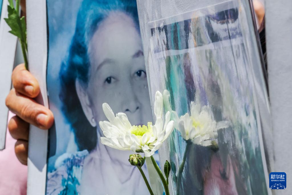 8月14日,在菲律宾马尼拉,参加游行的群众手持鲜花与“慰安妇”受害者的照片。新华社发 乌马利 摄