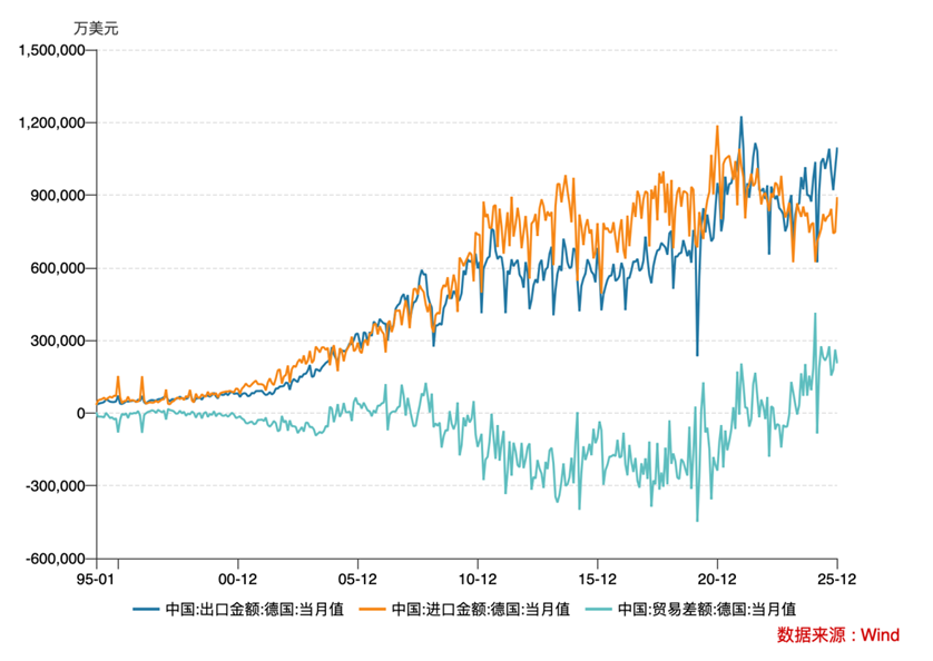 图2:1995-2025年中德进出口贸易及逆差发展变化情况