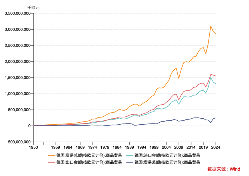 图1:1950-2024年德国进出口贸易发展变化情况