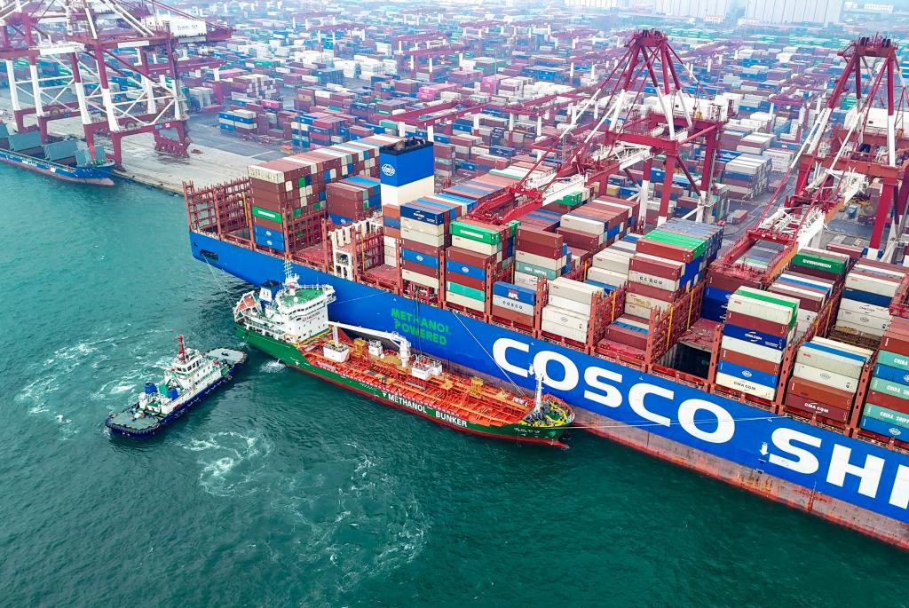 3月2日,在山东港口青岛港,甲醇加注船“建航利达”轮为一艘货轮进行绿色甲醇“船对船”加注作业(无人机照片)。新华社发(张进刚 摄)