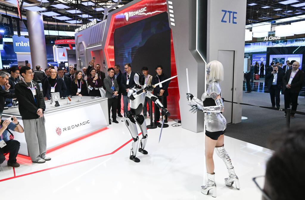 3月2日,在西班牙巴塞罗那,人们在中兴通讯展台观看机器人与真人“对打”。新华社记者 程敏 摄