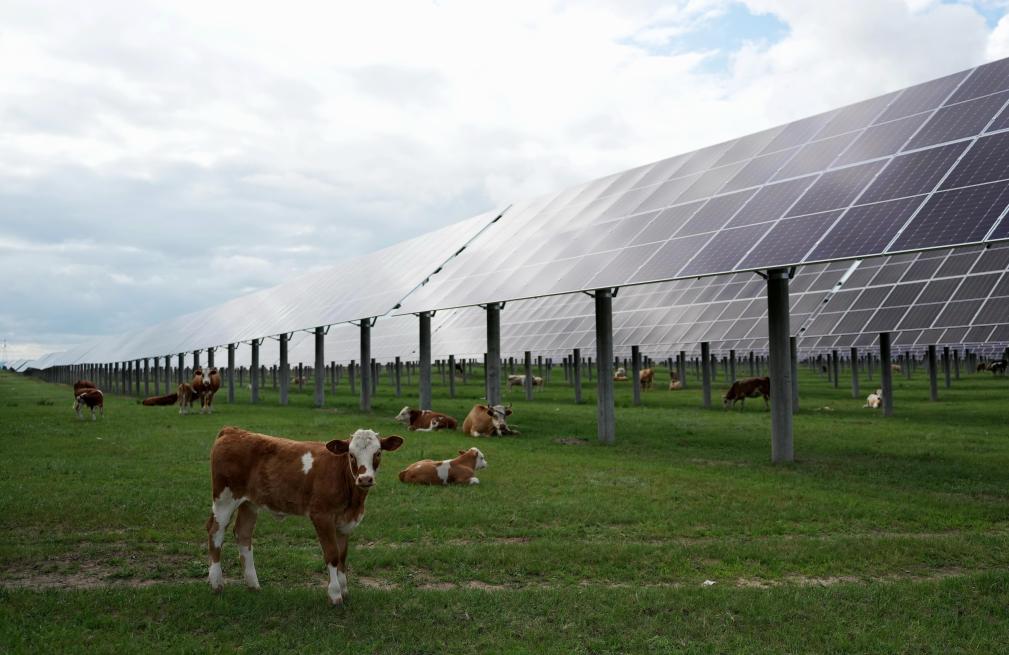 牛群在河北省围场满族蒙古族自治县御道口镇附近的一处“牧光互补”光伏发电场吃草(2024年7月25日摄)。新华社记者 杨世尧 摄