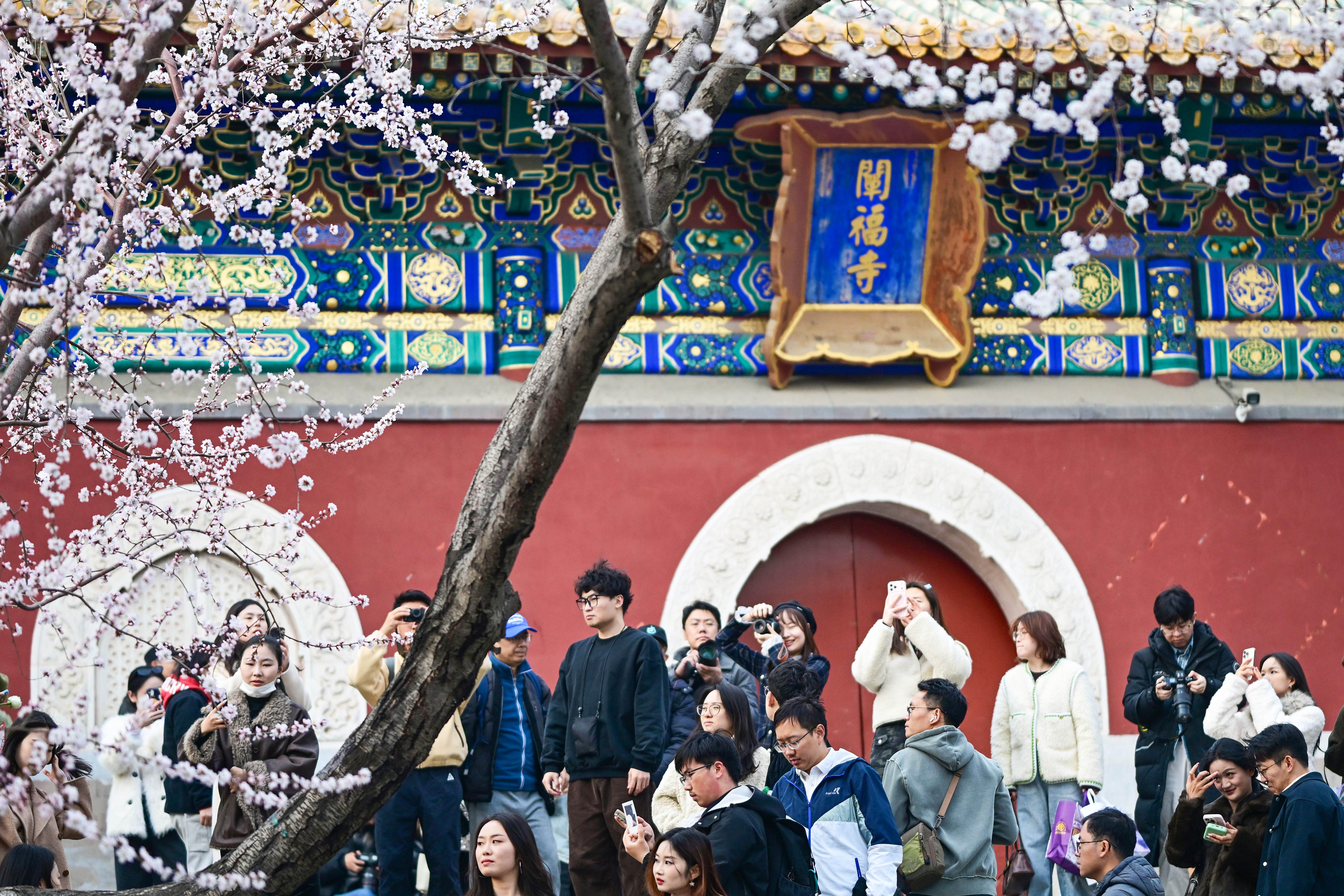 3月15日,游客在北京北海公园赏花。新华社记者 陈晔华 摄