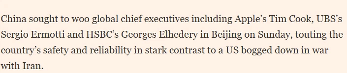 英国《金融时报》报道指出,中国在北京举行的论坛上积极吸引全球企业高管参与。在美国因对伊朗采取军事行动而陷入冲突的不确定性背景下,中国强调自身的安全性与可靠性,形成鲜明对比。