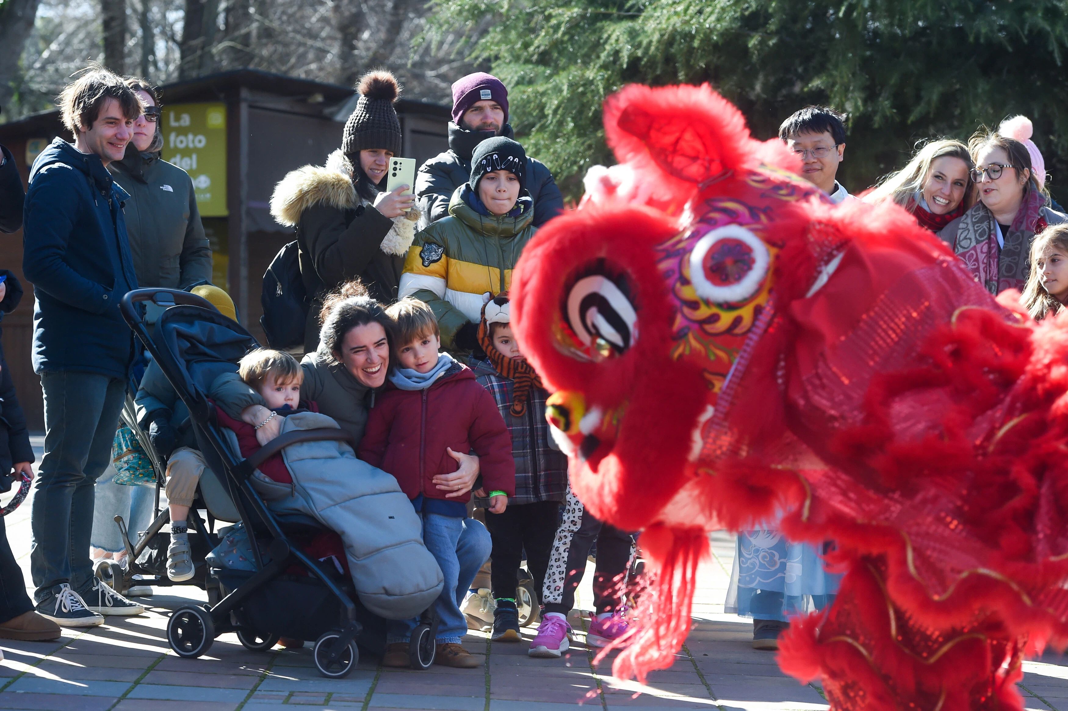 2月14日,游客在西班牙马德里动物园内观看舞狮表演。新华社发 古斯塔沃·巴连特 摄
